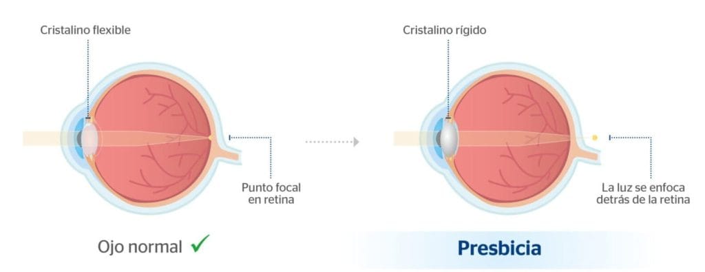 La presbicia es una condición ocular que se produce con el envejecimiento y que se caracteriza por la pérdida gradual de la capacidad de enfocar objetos cercanos. Es decir, a medida que envejecemos, nuestros ojos tienen más dificultades para enfocar textos pequeños, como los de un libro o una pantalla. Normalmente comienza a partir de los 40 años y va progresando paulatinamente hasta los 60 años aproximadamente.